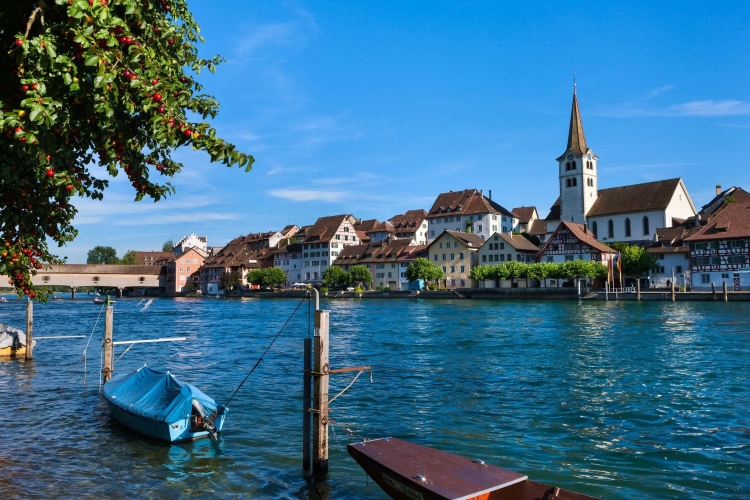 The view over the Rhine River towards Diessenhofen, Switzerland, offers a tranquil and picturesque scene of this historic town nestled on the riverbank. The town’s well-preserved medieval architecture, with charming buildings and narrow streets, creates a timeless atmosphere. From across the river, visitors can admire the wooden bridge connecting Diessenhofen to Gailingen, Germany, as it spans the gentle flow of the Rhine. Surrounded by lush green landscapes and the serene river, this view captures the beauty of the Swiss-German border and the peacefulness of riverside life.